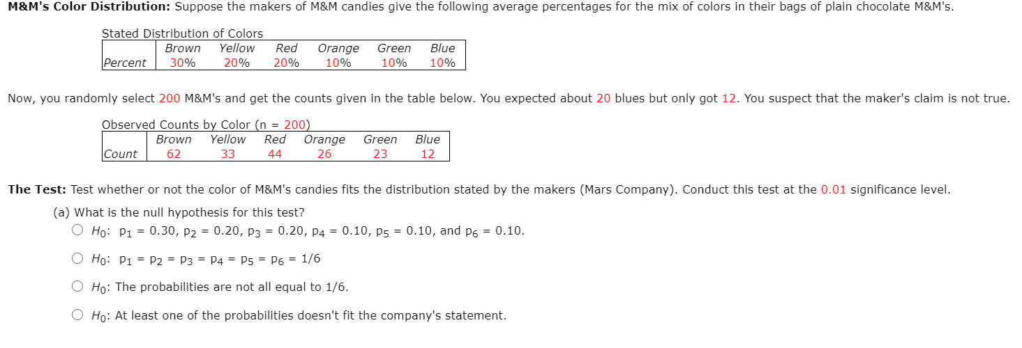 Solved Mem S Color Distribution Suppose The Makers M M Candies Give The Following Average Percentages For The Mix Of Colors In Their Bags Plain Chocolate M M S Stated Distribution Of Colors Brown Yellow